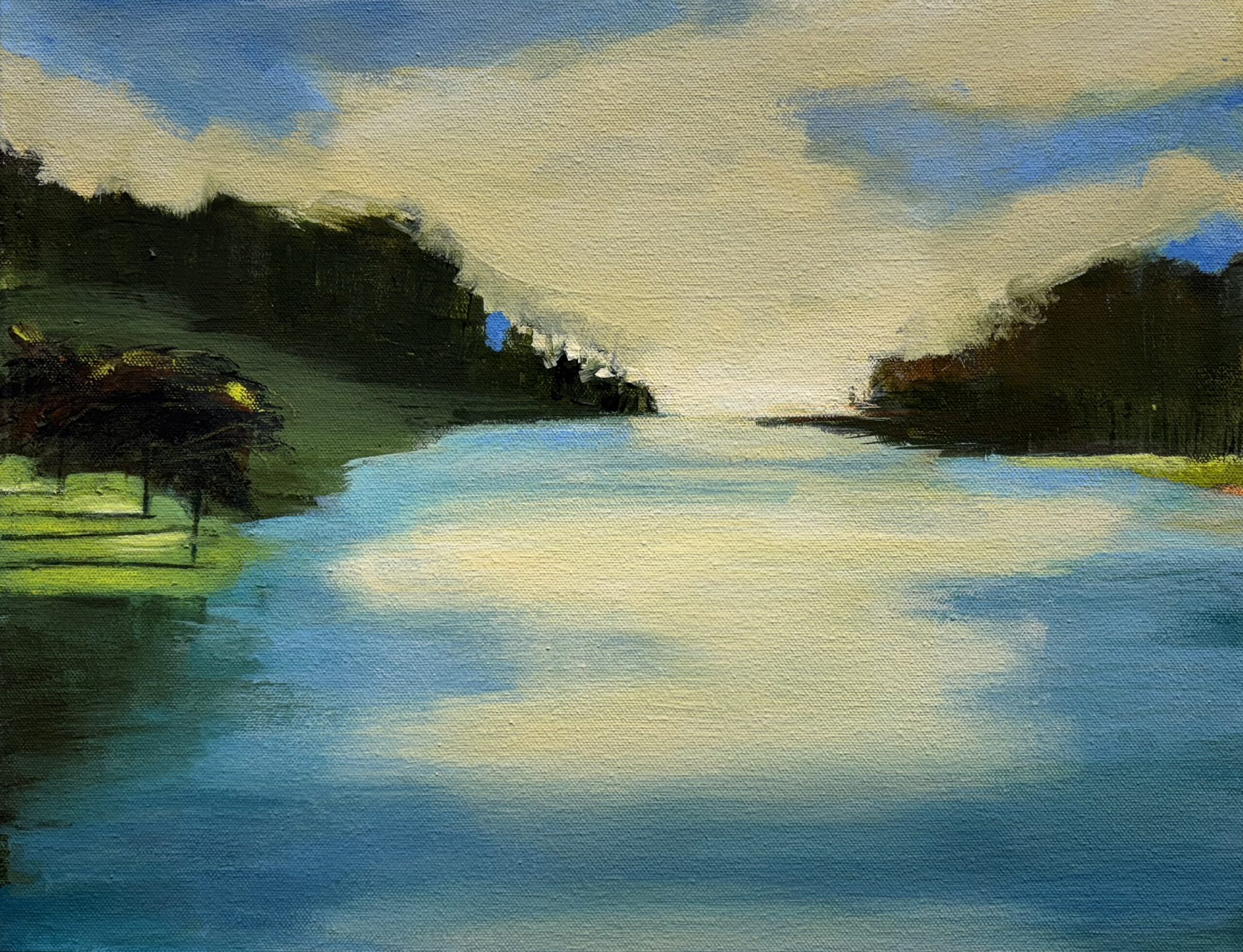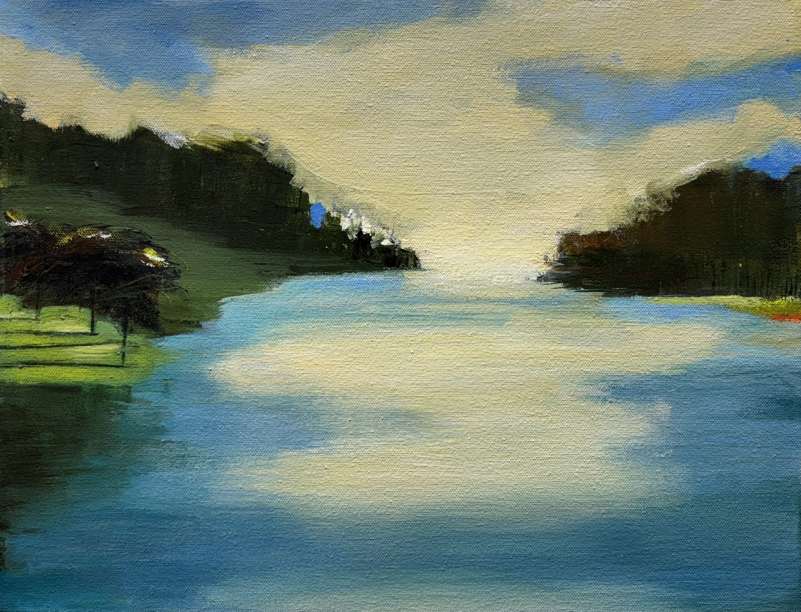 The reflection of morning light on a nearby lake reminded me of buttercream icing. This painting is acrylic and mixed media, framed in an elegant wooden floater frame.