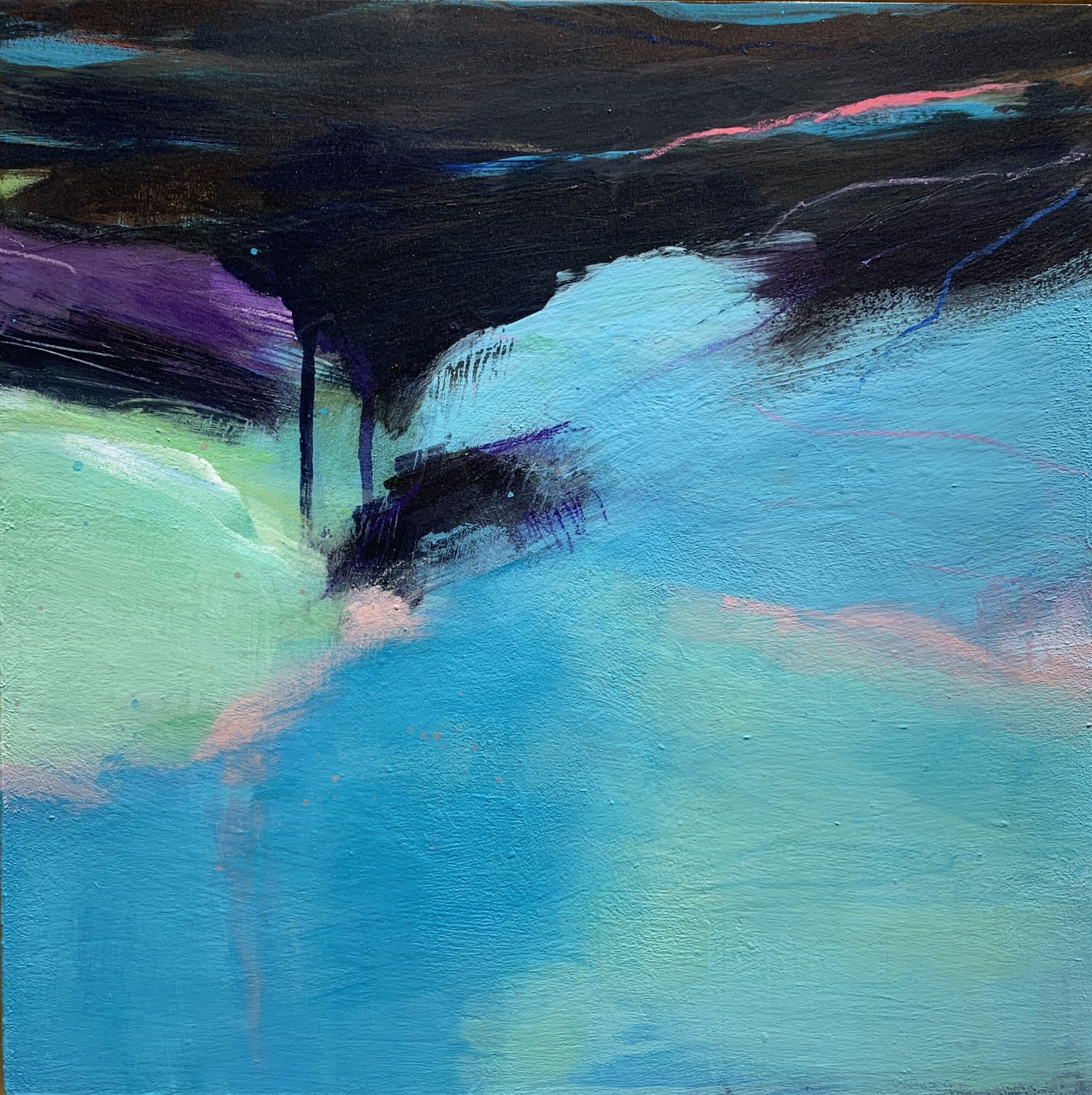 I love the drama of the dark shape at the top of this painting, transitioning into fluid blues and greens. The sense of transition reminds me of being on the cusp of change. When facing change I try to remind myself to enter it whole heartedly, to hold nothing back. Mixed media on cradled panel, framed in a simple maple floater frame.