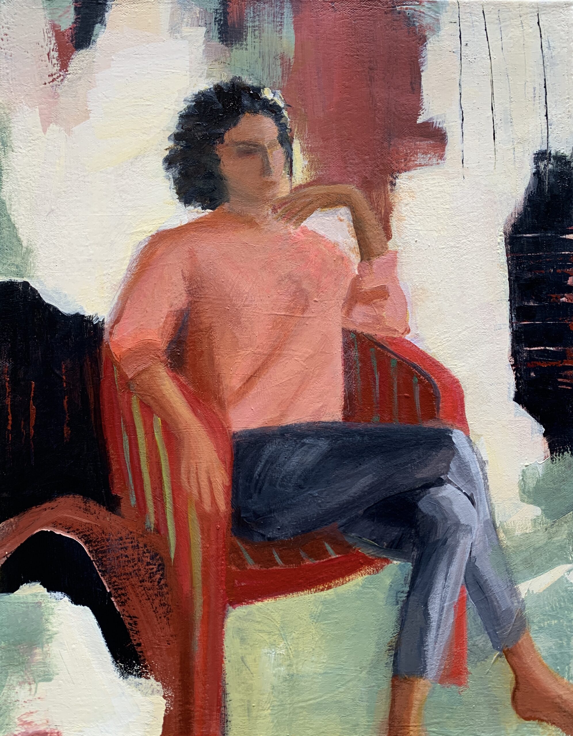 The figure in this painting was incorporated into an abstract design, creating a kind of dream scape: a world of her own. It is oil and mixed media on canvas, framed in a simple wooden floater frame.
