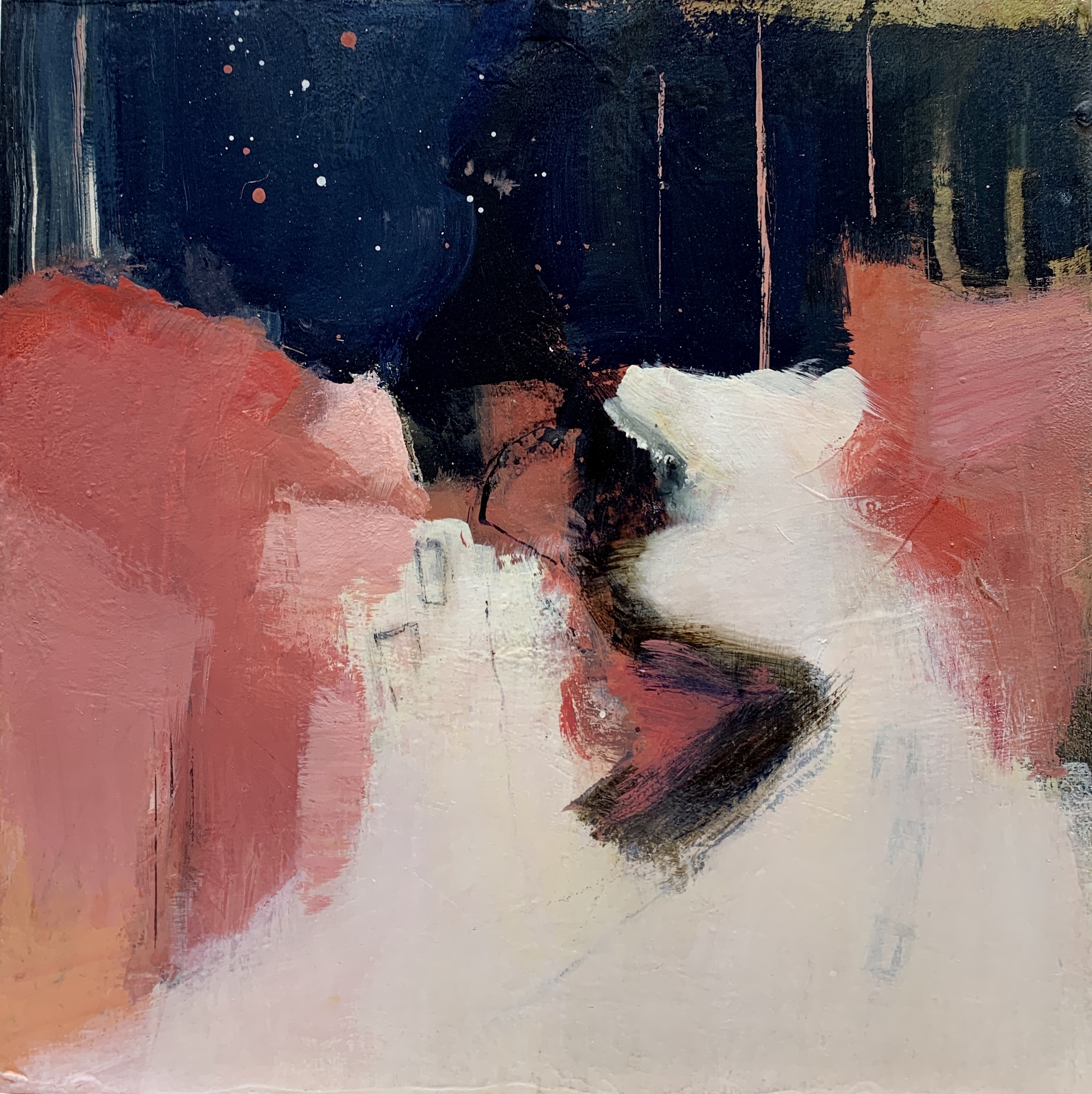 This mixed media painting on a framed panel has a festive, celebratory feeling. The different shades of pink against the midnight blue inspired its name: Midnight Soiree.