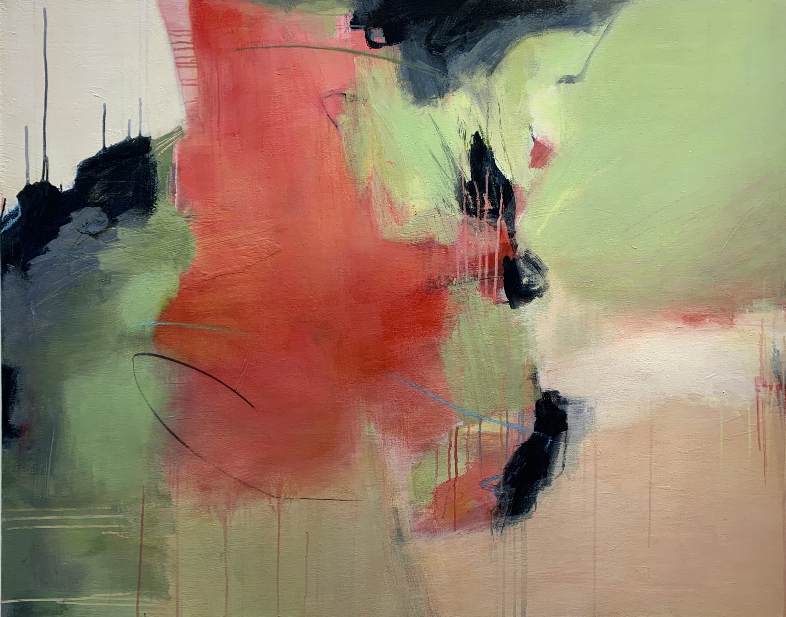 This large abstract landscape uses a palette reminiscent of Redbud trees and the wildflower, Shooting Stars. It also has the energy of shooting stars, with its diagonal composition and expressive mark-making. It is 40x50 mixed media on canvas, sealed and varnished.