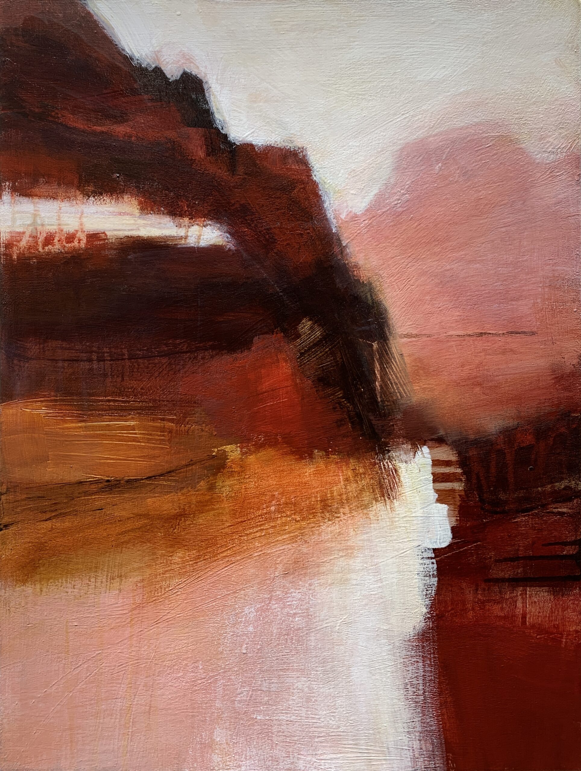The deep red clay and rocky peaks of the High Atlas Mountains of Morocco inspired this mixed media painting. It is on a cradled panel in a floater frame.