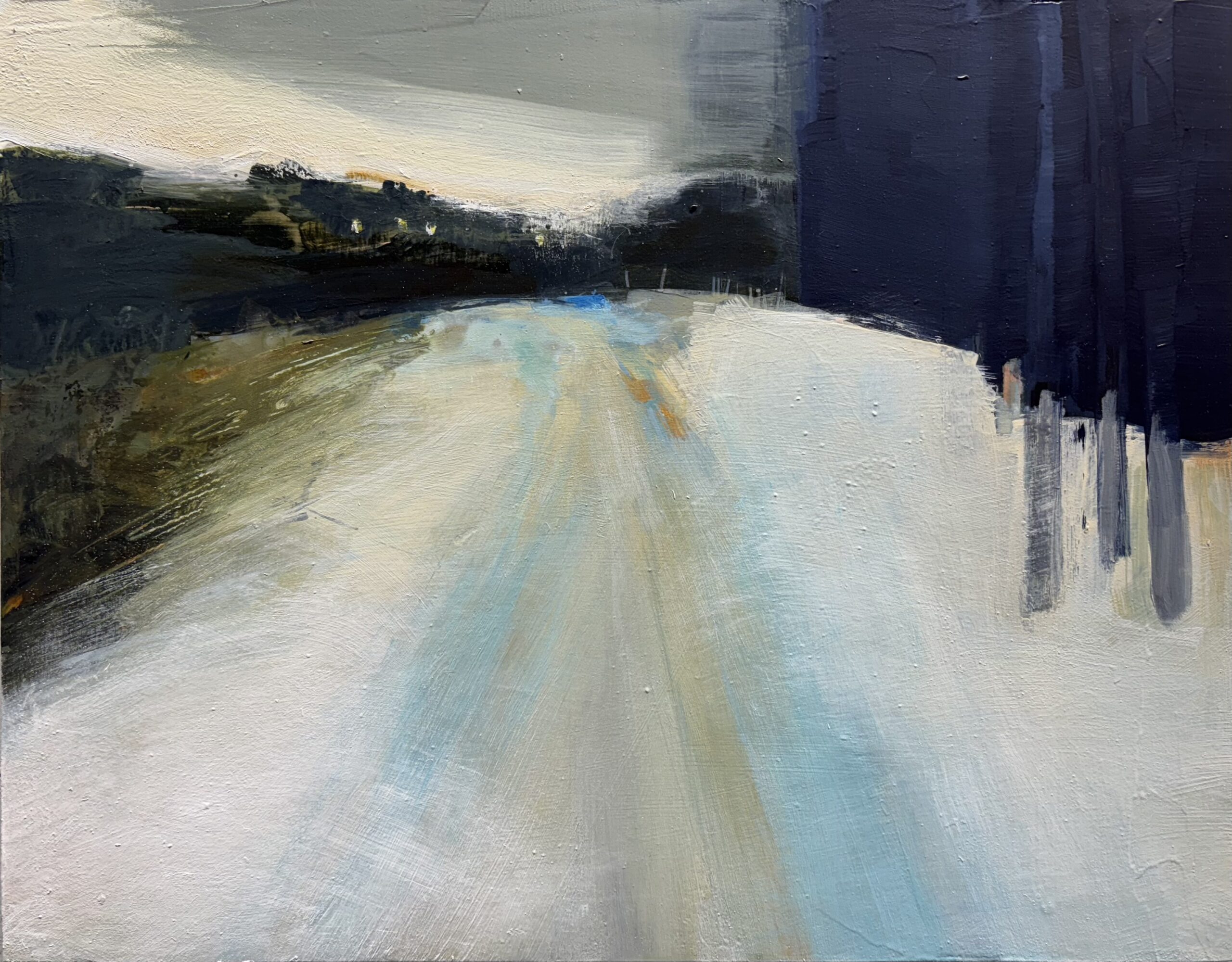 The inspiration for this painting happened on a walk one winter afternoon. Suddenly the slate-colored sky cast a silvery veil over the snow covered meadow before me, lighting up ethereal blue shadows in the snow. I used mixed media on a cradled panel and framed the piece in a light wood floater frame.