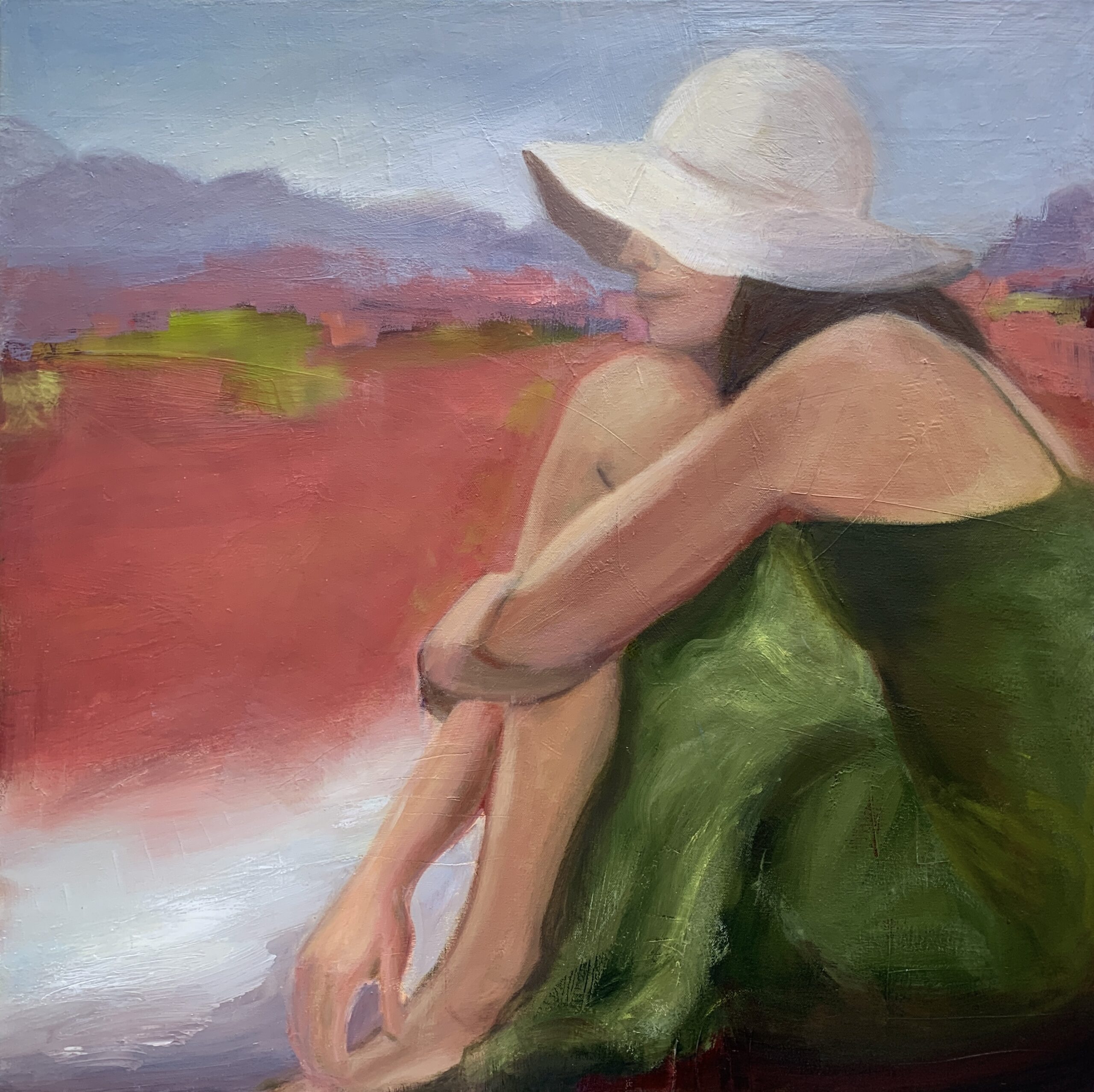 In Spring the alpine meadows where I live are covered by bright pink wildflowers called Shooting Stars. The figure in this painting is captivated, just like I am. The painting is oil on canvas.