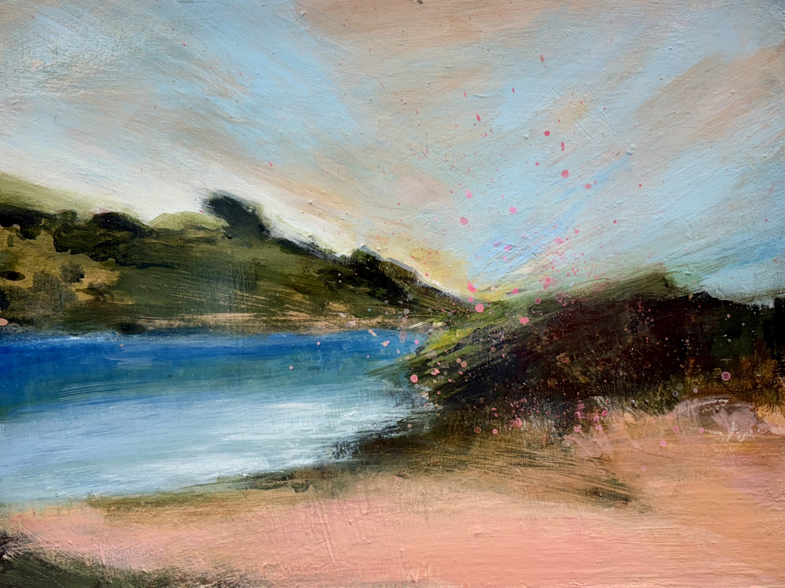 Wild Western Azaleas are among the sweetest smelling blossoms in the world. They surround the alpine lakes and creeks where I hike, captivated by their lingering fragrance. This small mixed media landscape is in a simple wooden floater frame.