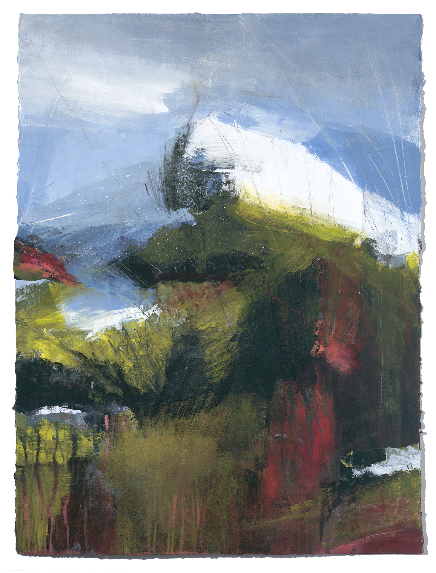 This collage painting is on heavy watercolor paper with deckled edges. Several paintings were torn into collage pieces and integrated into the original work to create interesting and unexpected passages. The entire piece reflects the darkness as well as the dazzling light of an alpine winter day. It is float mounted in a natural wooden frame under archival plexiglass. The framed dimensions are 34x26x2. The layers of pink, orange and mossy greens remind me of the dappled light and abundant life underneath the forest's leafy canopy.