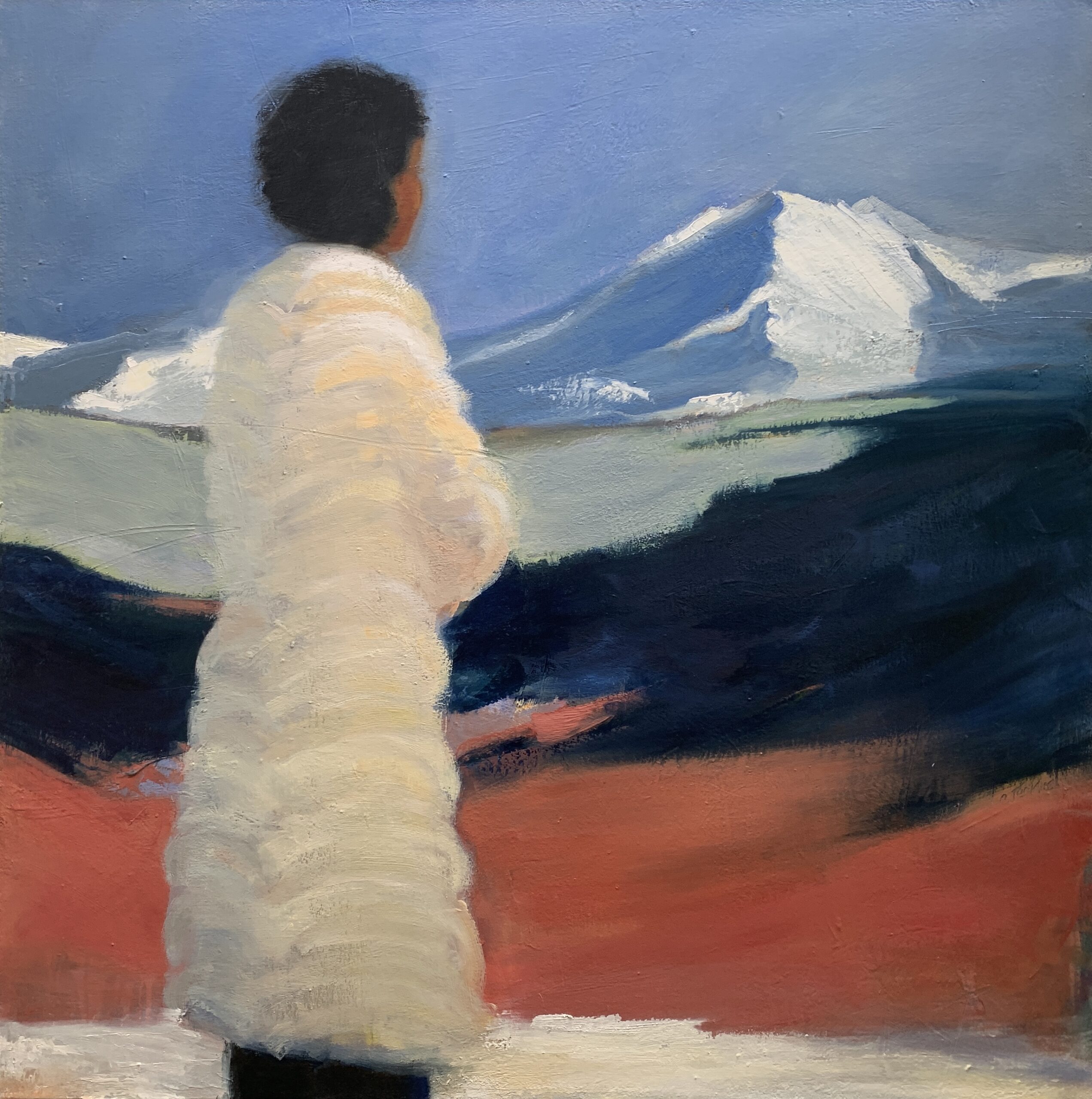 The coat wrapping the figure in warmth reminds me of pearls. Just like snow, the white of the coat is illuminated into many different colors, opalescent, prismatic. We are all multi-hued. The painting is oil on canvas.